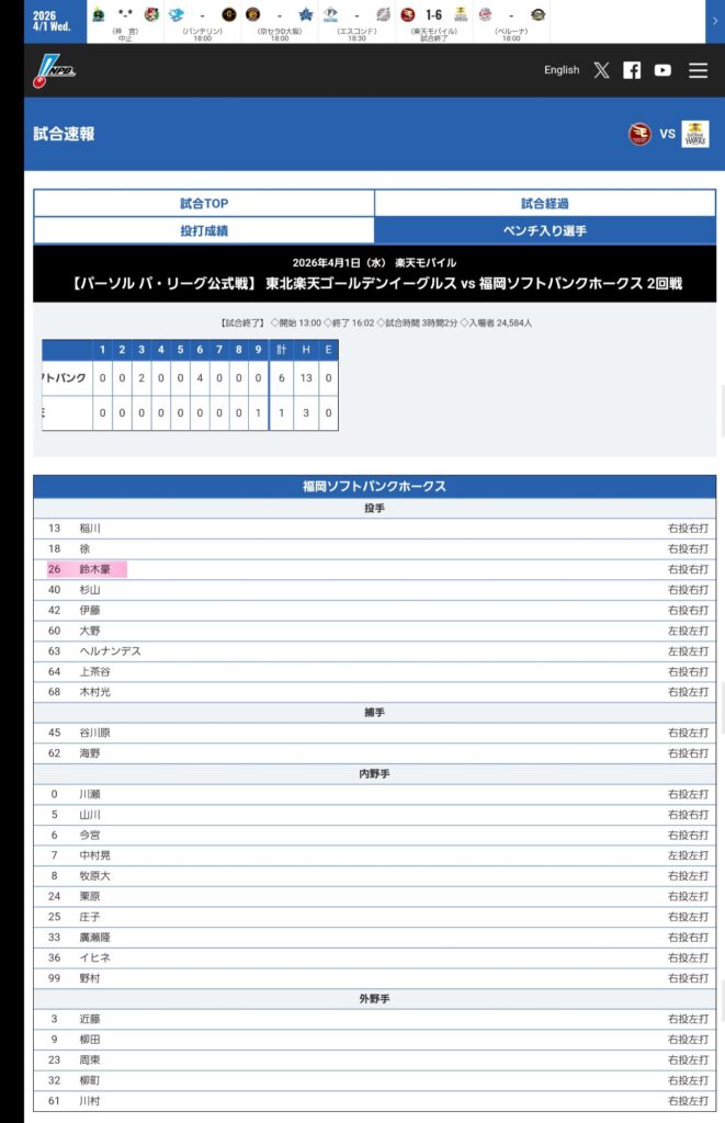 今日の試合にも1軍ベンチ入りしています